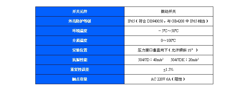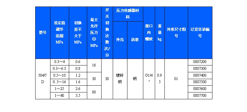 504/7D壓力控制器采用帶泄油口的活塞式傳感器,可用于中性液壓油等介質。504/7D壓力控制器的設定值可調,調節范圍0.3~40MPa。